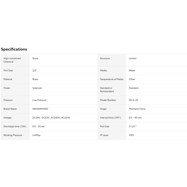 Material: Buffing BrassnBody: Solenoid Automatic DrainernPort Size: G 1/2nDischarge time (ON): 0.5 ~ 10 secnTemperature of Media: OthernPressure: 1.6Mpannn|Air Compressor Drain Valve Solenoid|Air Compressor Drain Solenoid|nn**Robust Design and Performance**nThe SR-D-15 G1/2 Auto Drain Air Compressor Brass Vent Device Valve is a robust and reliable piece of equipment designed to manage condensed water from compressed air systems. Crafted from high-quality buffing brass, this valve is built to withstand the rigors of industrial environments. The solenoid-controlled mechanism ensures precise and efficient draining, with a discharge time ranging from 0.5 to 10 seconds, making it suitable for various applications.nn**Versatile and User-Friendly**nThis air compressor drain valve is not just any ordinary valve; it's an intelligent solution for managing water in compressed air systems. With an interval time adjustable from 0.5 to 45 minutes and a pressure rating of 1.6Mpa, it caters to a wide range of scenarios. The valve's design allows for easy installation and maintenance, making it a valuable asset for technicians and engineers. Its compatibility with various media types and its ability to withstand high temperatures up to 105℃ make it a versatile component in any compressed air system.nn**Enhanced Durability and Reliability**nThe SR-D-15 G1/2 Auto Drain Air Compressor Brass Vent Device Valve is engineered to provide long-lasting performance. It's designed to handle a wide range of pressures, from low to high, ensuring that it can adapt to various system requirements. The solenoid valve is available in both normally closed and normally open configurations, allowing users to choose the most suitable option based on their specific needs. Whether it's for a filter separator, gasholder, or compressed air system components, this valve is the go-to choice for reliable and efficient water management. |